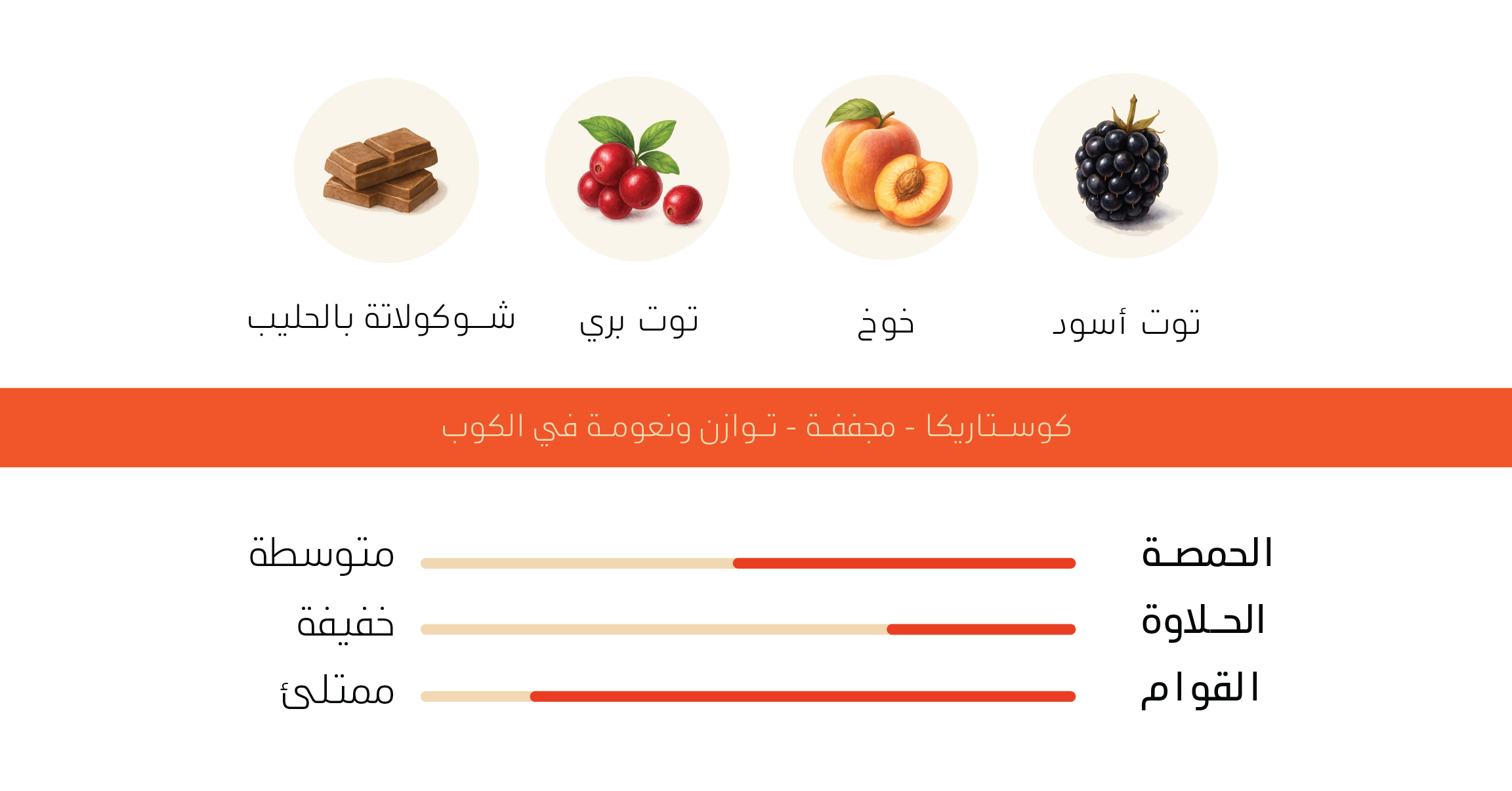 نكهات فاكهية من توت أسود، خوخ، توت بري، مكملة بالشوكولاتة بالحليب.